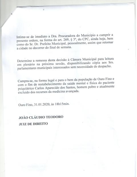 O Juiz de Direito João Cláudio Teodoro atendendo o clamor da população, determinou que a prefeitura internasse Carlos Aparecido dos Santos até o começo da noite desde sábado (01)