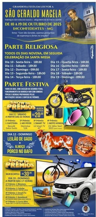A cidade de Inconfidentes, Minas Gerais, recebe a Grandiosa Festa em Louvor a São Geraldo Magela, um dos eventos religiosos e sociais mais importantes da região. A celebração acontecerá entre os dias 10 e 19 de Outubro. O tema da festa deste ano é: "Com São Geraldo, sejamos peregrinos da esperança e fortes na oração."